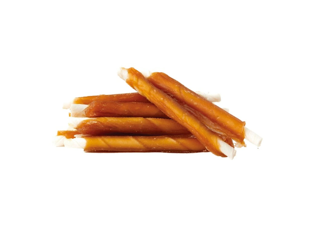 Přírodní masová tyčka z hovězí kůže obtočená plátkem lahodného kuřecího masa.