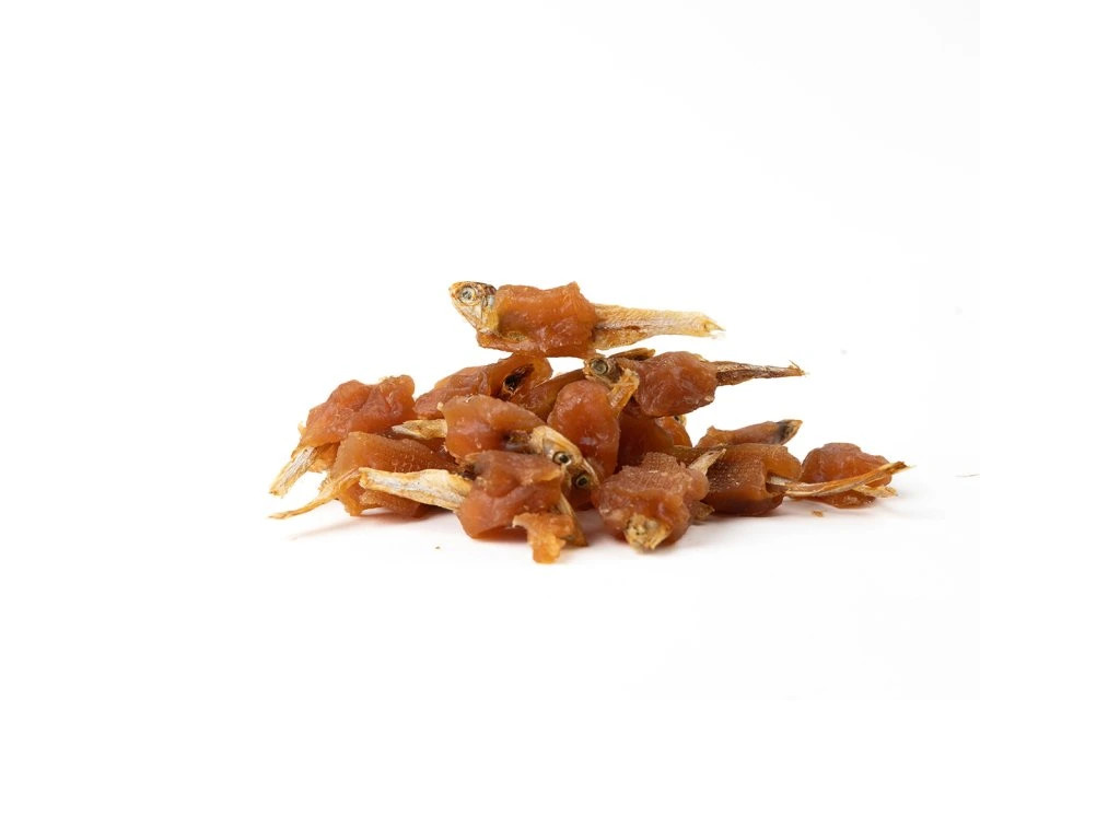 Měkká, přírodní masová pochoutka pro psy. Sušená rybka omotaná proužkem kuřecí svaloviny.