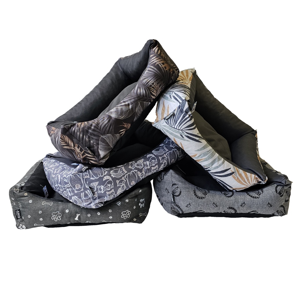 Látkový pelíšek pro psy s vyvýšeným polstrovaným okrajem.