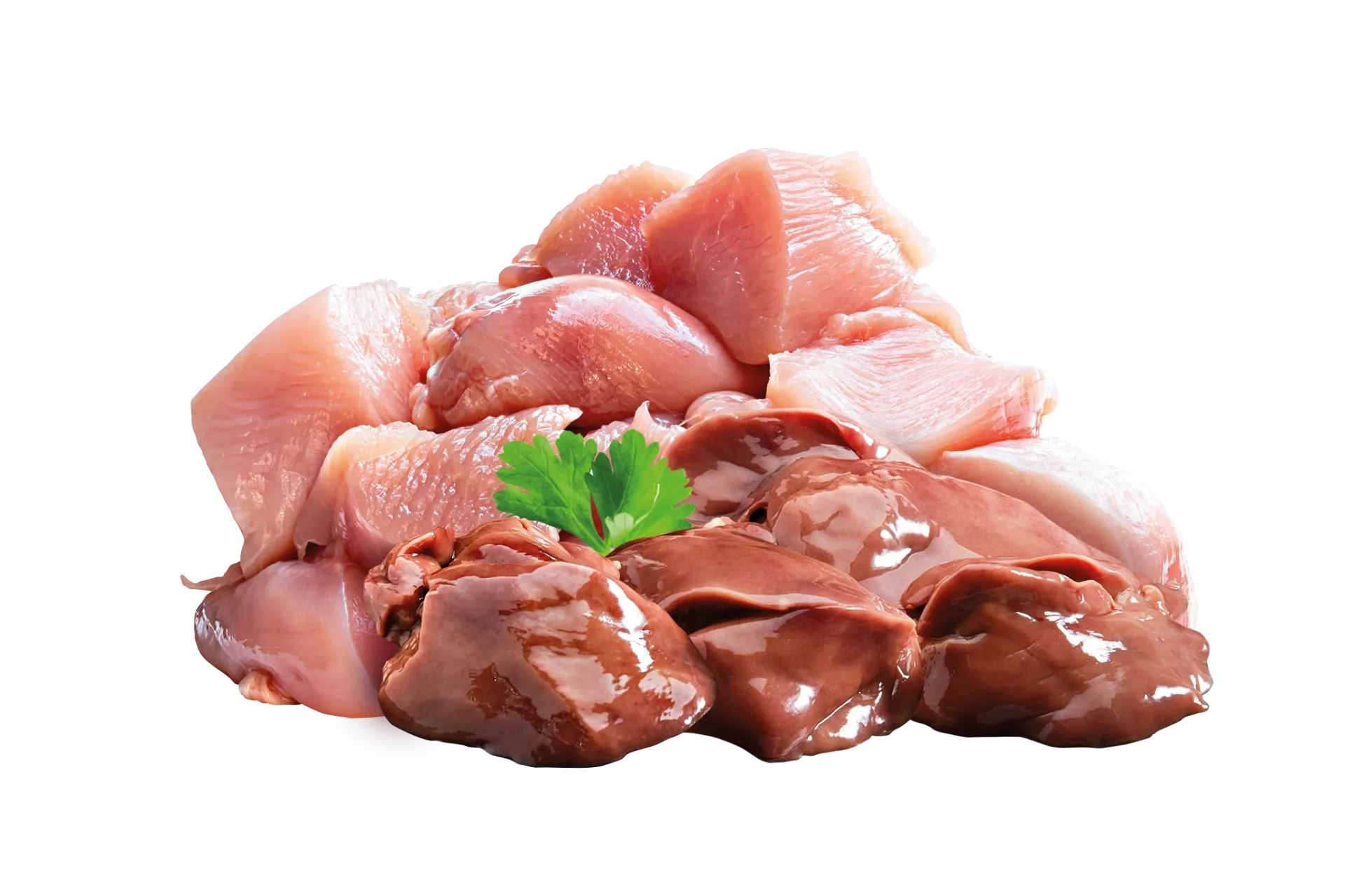 Složení: Kuřecí maso a orgány 60 %, játra 5 %, hrachová mouka 2 %, lignocelulóza 1 %.