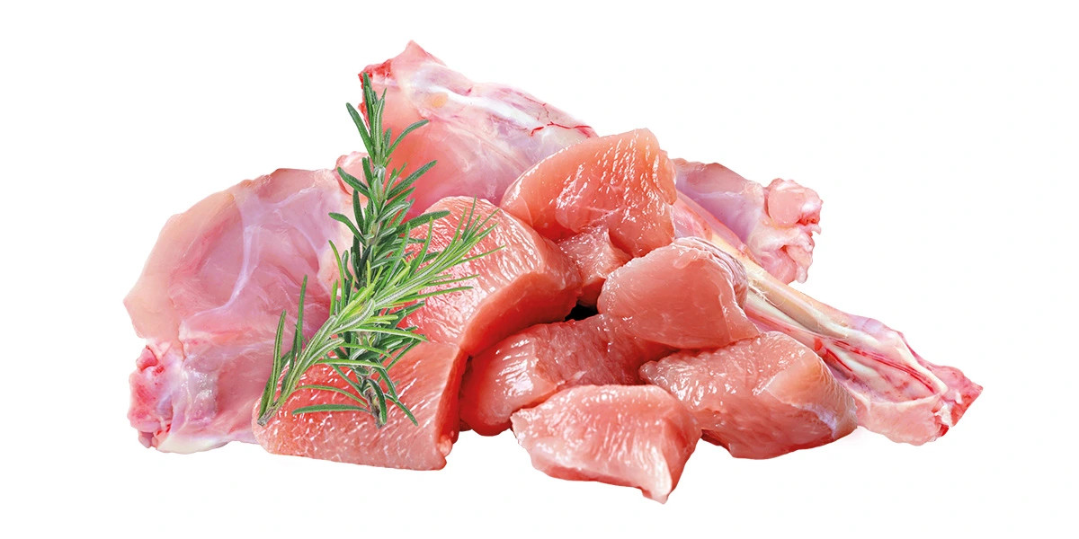 Složení: Kuřecí maso a orgány 39 %, králičí maso a orgány 26 %, hrachová mouka 2 %, lignocelulóza 1 %. Analytické složky: Hrubý protein 9 %, hrubý tuk 5 %, hrubý popel 2,2 %, hrubá vláknina 0,5 %, vlhkost 78 %, vápník 0,2 %, fosfor 0,3 %, sodík 0,25 %.