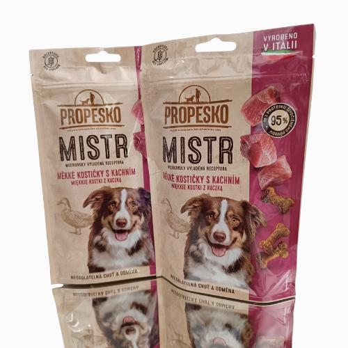 Složení: maso a výrobky živočišného původu (min. 60 %, z toho kachní min. 8 %), vedlejší výrobky rostlinného původu, oleje a tuky, propylenglykol.